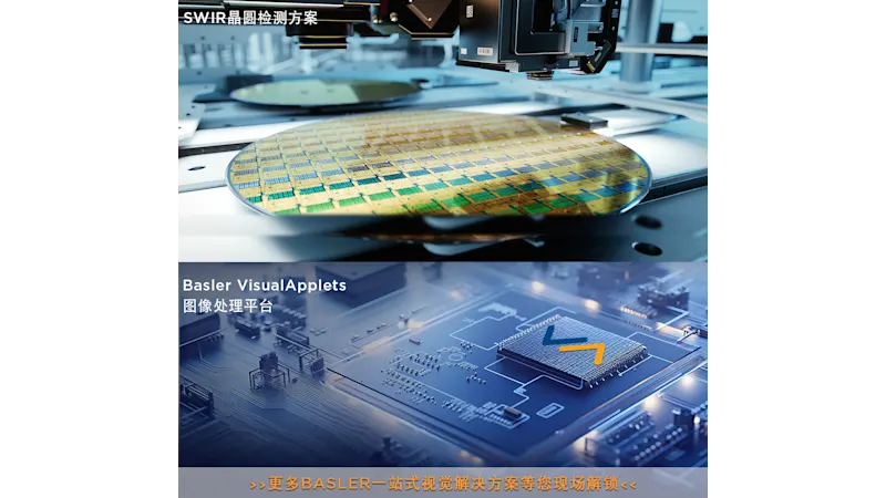 其中SWIR晶圆检测方案采用Basler最新发布的ace 2 visSWIR短波红外相机,集成高性能CMOS芯片,搭配高放大倍率的显微物镜,为满足半导体行业晶圆检测中分辨率和成像质量的更高要求提供了解决方案。